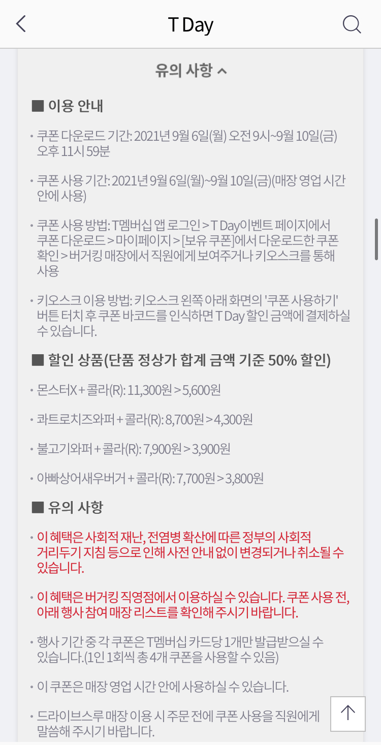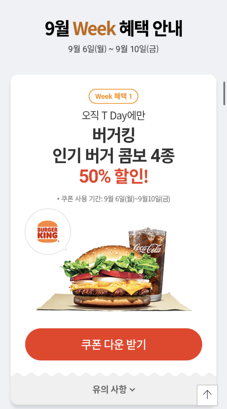 버거킹 T day 인기 버거 콤보 4종, 50%할인