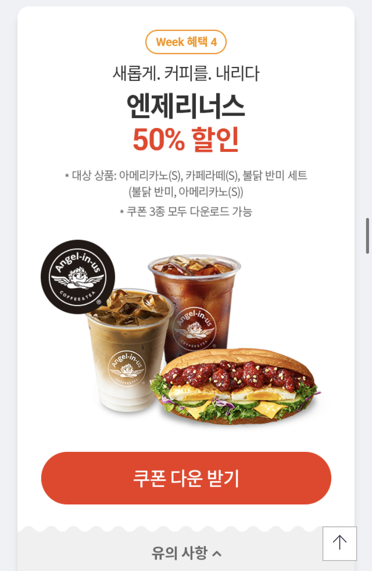 카페라떼(S)1잔 : 4,800원>2,400원(50%할인)